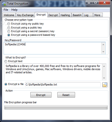 Total Encryption supports almost all types of RSA Public/private key pair based encryption/decryption of text data and text/binary files, MD5 and SHA Hashing of text data and text/binary files.