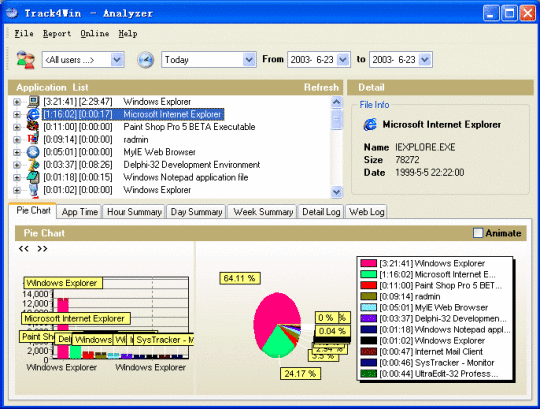 Track4win can monitor and analyze multi-computer activity and Internet usage, track Web site address (URL) visited, log work time on each software application, and record which files are changed in your networked computers. It can monitor a single PC, or all workstations in a network (corporate/office LAN, remote WAN, VPN, Internet or intranet where TCP/IP is installed).