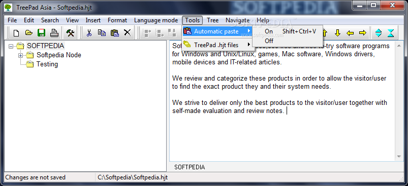 It's possible to paste content from the clipboard, search for words in the tree or article, insert the date, time and hyperlinks from files and convert the characters to uppercase and lowercase.