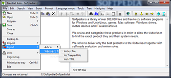A distinct function that TreePad Asia comes with is the choice to change the language mode from single/double width alpha, Katakana, Hanguel or Chinese. You have the option to export the articles or the trees to TXT or HTML file formats.