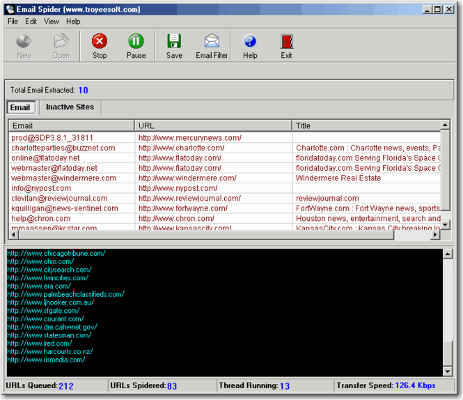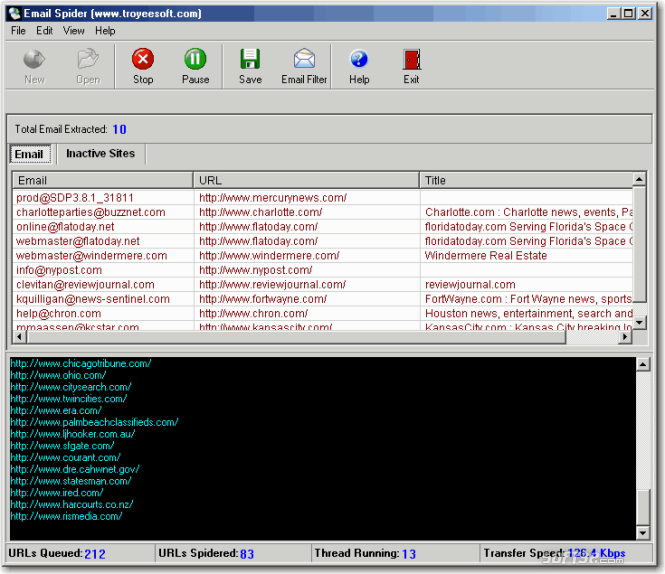 You can download TroyeeSoft Email Spider which is 1.17 MB in size and belongs to the software category E-mail. TroyeeSoft Email Spider was released on 2012-02-15 and last updated on our database on 2017-06-14 and is currently at version 3.
