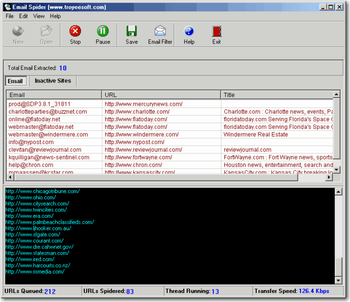 Advanced and powerfull tool for extracting email, page title, page URL from website, popular search engines (google, altavista, excite, yahoo, infoseek etc.) using keywords for targeted consumer, internet marketing, website promotion, list management and research. You can build business mailing lists for email marketing, advertising. Using Email Spider you can not only limit spdering depth, you also can cut off unnecessary text or phrases during extraction. It is very flexible and can be used to extract data from internet using file containing list of urls. You can filter the extracted email with Email Spider according to your business needs. You can also save data in different format (csv, html, Excel or plain text).