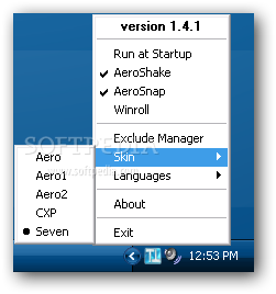 TrueTransparency doesn't come with a proper interface. Instead, it sits in your system tray and right-clicking its icon provides access to all its options. These include the possibility to enable three different features, AeroShake, WinRoll and AeroSnap. The program also has some customization preferences, letting you choose between multiple skins.