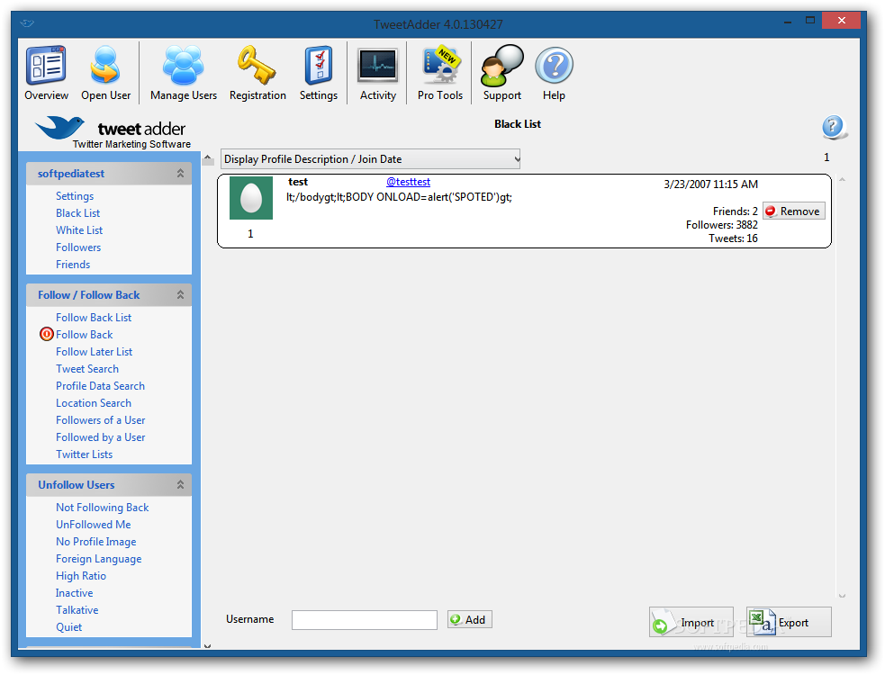 You can download Tweet Adder which is 6.32 MB in size and belongs to the software category Chat. Tweet Adder was released on 2015-04-17 and last updated on our database on 2017-04-05 and is currently at version 4.1.