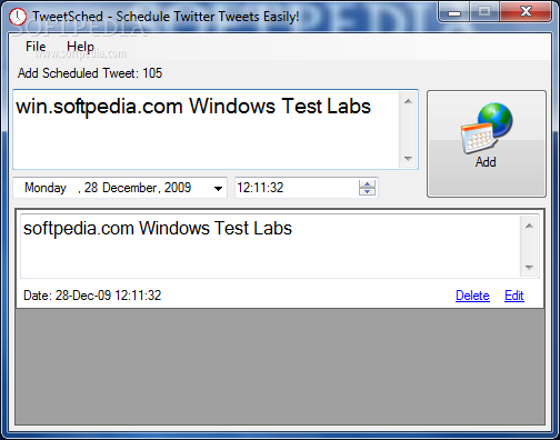 TweetSched is a free software by DCA Software Development and works on Windows 10, Windows 8.1, Windows 8, Windows 7, Windows 2012.