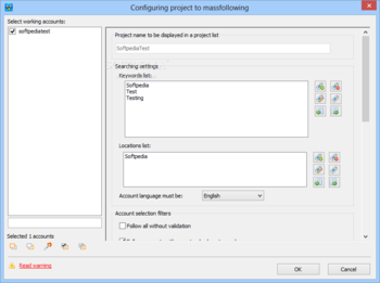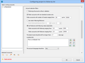 In mass following mode the program will search accounts by keywords, verify them with your parameters and follow them automatically. For account searching you can use 7 parameters.