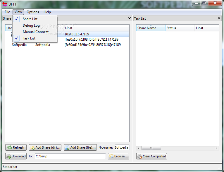 Users will be able to add their folders and files to the Share List, set their nickname and select the destination directory as easy as 1-2-3.System requirementsLocal Area Network or Internet Connection