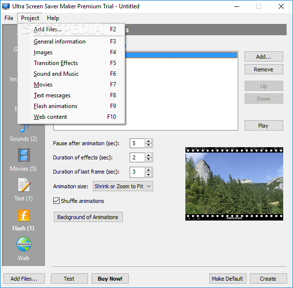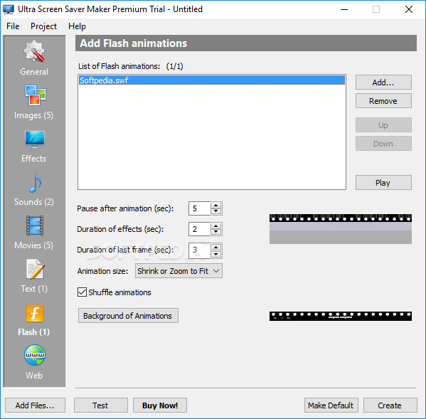 Adding text messages to screensaver You can add Flash animations in your screen saver. Ultra Screen Saver Maker recognizes Macromedia SWF Flash files, and can play them in their original size, or in the full screen. You can preview animation, and set its background.