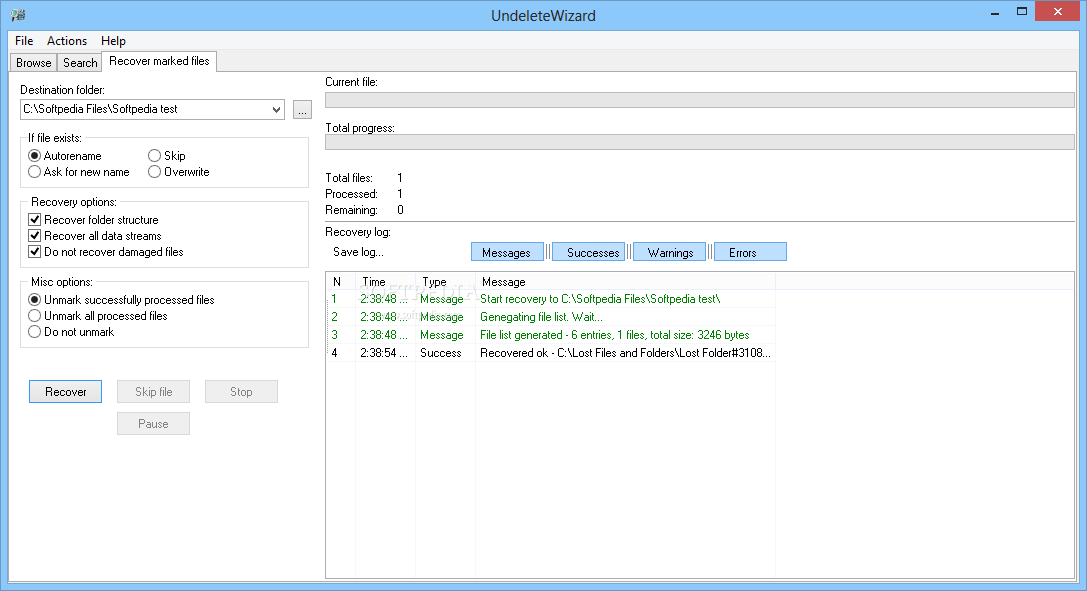 UndeleteWizard can find erased and lost files and allow you to decide what action to undergo about them. You can mark the files you wish to recover and make the final settings in the Recover marked files tab.