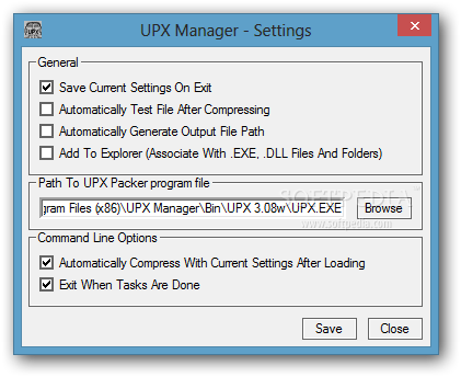 UPX Manager is a small, easy to use application specially designed to offer you a tool that allows you to execute various UPX (Ultimate Packer for eXecutables) command line arguments.