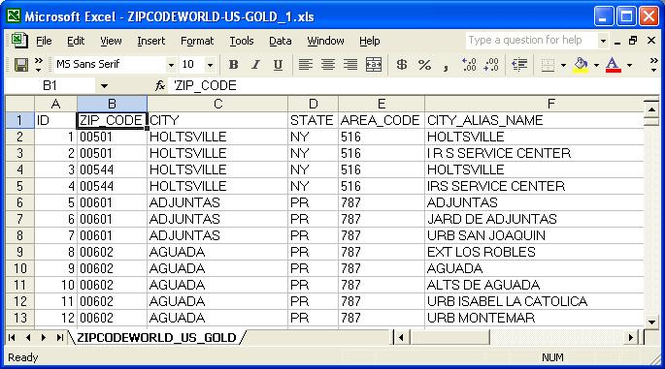 United States ZIP codes database one month subscription service. The database includes Mixed Case City Name, 5-Digit ZIP code, uppercase city name, alias city name, state code, phone area code, city type, county name, country FIPS, time zone, day light saving flag, latitude, longitude, county elevation, MSA, PMSA and Census 2000 data in United States. The complete database contains over 76,000 precise records. Immediate download available in several formats ie. ASCII text, Microsoft Excel, Microsoft Access and dBASE V.