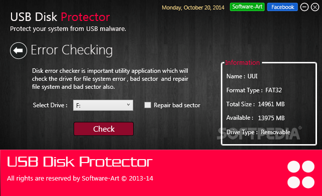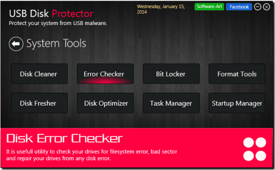 USB Disk Protector comes as a bundle of functions for your computers protection and optimization. The software can prevent data hiding, block the usage of the USB, enable writing protection or drive vaccination, when it comes to security about USB pen drives. Moreover, the software can scan the contents of any given flash memory. It can then display a list of the potential risk-full files, stored on the selected drive. You may easily select them individually and remove them or send them to quarantine. Additionally, you may perform error checking for file system irregularities, bad sectors and repair any issues. Moreover, you can use the Disk Fresher or Disk Optimizer in order to obtain quicker access to any drive on your computer.