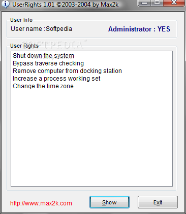 UserRights is a free software by Max2k and works on Windows 10, Windows 8.1, Windows 8, Windows 7, Windows XP, Windows 2000, Windows 2003, Windows 2008, Windows Vista, Windows 2012.