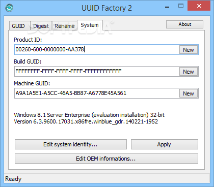 UUID Factory features the option of modifying your system’s information, being able to assign it a new ‘Product ID’, ‘Build GUID’ or ‘Machine GUID’. It even allows you ‘Edit System Identity’.