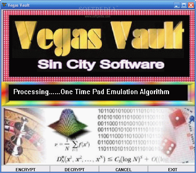 Vegas Vault is the Worlds Strongest Data Encryption Program. It uses every major data encryption algorithm, one way hash function, pseudo-random number generator, and hundreds more esoteric entropy randomization algorithms. This program is in the public domain and comes with all 1100+ C source code functions. It uses the Indium random number generator to emulate a One Time Pad of numbers, these numbers are then encrypted using all the major stream and block ciphers.