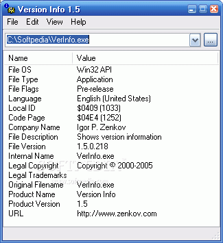 Version Info is a free software by Igor P. Zenkov and works on Windows 10, Windows 8.1, Windows 8, Windows 7, Windows XP, Windows 2000, Windows 2003, Windows 2008, Windows Vista, Windows 2012.