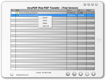 You can download VeryPDF iPad PDF Transfer which is 6.94 MB in size and belongs to the software category Office IPOD tools. VeryPDF iPad PDF Transfer was released on 2012-12-31 and last updated on our database on 2017-03-07 and is currently at version 2.