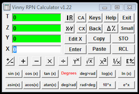 Vinny RPN Calculator is a Reverse Polish Notation utility program for science and engineering students. It temporarily converts the computers numeric key pad into a RPN calculator. Number inputs can be decimal or exponential with dot or comma (European) digit separator.