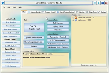 A repair tool to assist end-users remove the effects, of either a live virus or left over by a virus, in most Windows Operating Systems (see requirements.) Repairs and fixes OS items such as: Taskmanager Regeditor MSconfig Folder Options and it even repairs the Windows Automatic Update, bringing it back to full operation again. As well as many USB control options, not normally available in Windows OSes, to protect our end-users, against accidental viral infections carried by any USB media. i.e. Pendrive etc. Additional tools, help users track and kill the virus, and remove the infection from the OS. With just a single Operating System reboot to clear it all out, after cleaning is complete.