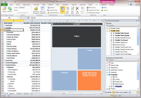 Vivid is a powerful add-in for Microsoft Office that extends Excel (2007 & 2010) with new features that will allow your organization to more effectively collaborate, while at the same time greatly simplifying the process of building insightful pivot tables, even against the most unwieldy SQL Server Analysis Services OLAP cubes. You will soon never want to use Excel without Vivid.
