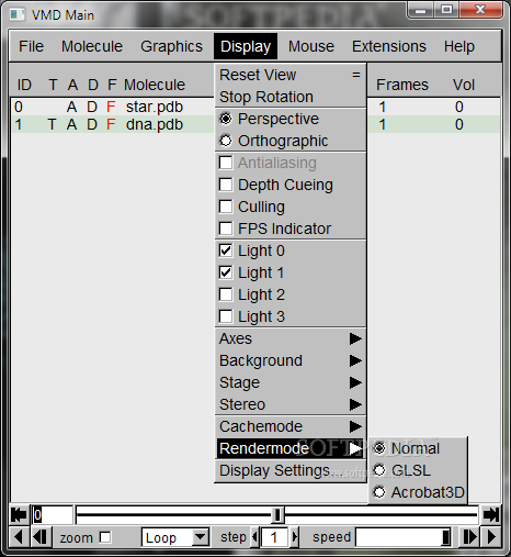 The OpenGL Display window will show you the graphical representation of the molecules you pick and the colors, materials and labels can be customized from the dedicated modules of VMD. Also, the display options can be easily modified so you can choose the desired light, axes or type of background.