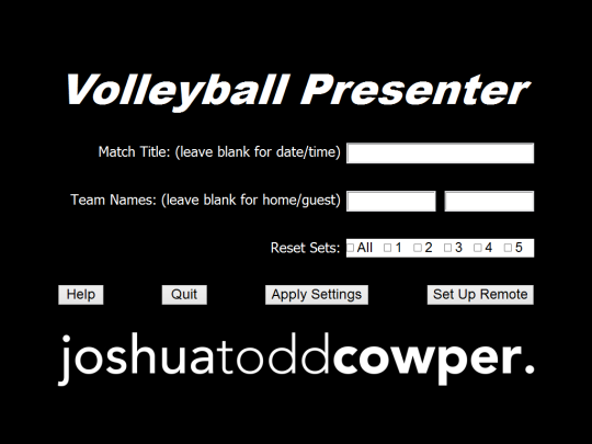 Volleyball Presenter is a free software by Joshua Todd Cowper and works on Windows 10, Windows 8.1, Windows 8, Windows 7, Windows XP, Windows 2000, Windows 2003, Windows 2008, Windows Vista, Windows 2012.