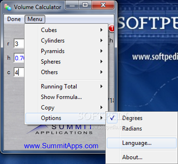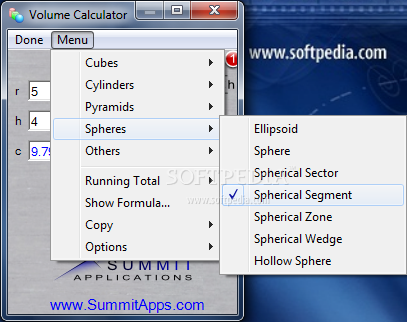 Volume Calculator is a demo software by Summit Applications and works on Windows 10, Windows 8.1, Windows 8, Windows 7, Windows 2012.