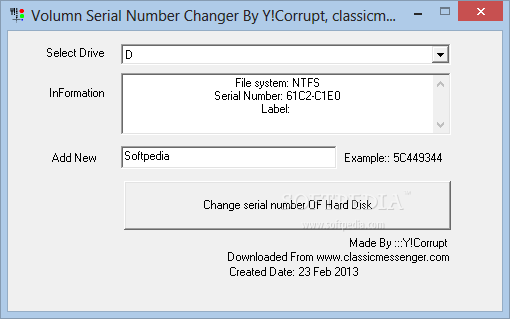 Volumn Serial Number Changer is a free software by Y!Corrupt and works on Windows 10, Windows 8.1, Windows 8, Windows 7, Windows 2012.