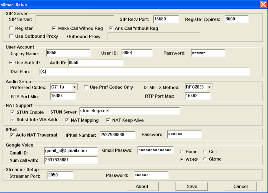 vSmart has built-in support for Google Voice and IPKALL: 1. Dial Google Voice and IPKALL directly, no other services needed, simple and easy!2. Make and receive FREE calls from anywhere in the world.3. Turn your home PC into a SIP gateway, make and receive calls from your Android devices.4. Auto NAT/Firewall traversal.