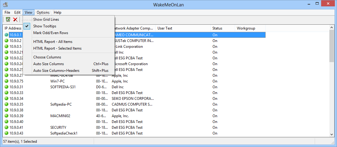 Henceforth, you can make a selection of one, more or multiple computers, and send them a WOL packet through the context menu. Other options of WakeMeOnLan can generate an HTML report of all or selected items, add a new computer to the list or edit the properties of an existing one (IP and MAC address, machine name, user text), create an icon in the system tray area, specify an IP address range to scan, use a particular network adapter, and more.