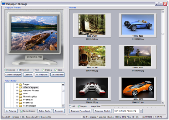 Wallpaper XChange allows you to set .bmp, .gif, .jpg, and .png images files as wallpaper. It has a graphical image browser to help select a particular file, with customizable image sizes and offers a list view of image files and allows you to sort by name, size, date, or resolution. It has a preview area complete with monitor effects such as inner shadows and a glare and an optional caching system to make loading directories lightning quick. It allows you to easily delete/copy/rename files, and supports drag and drop and offers high quality bicubic interpolation to resample images to your screen resolution. It has an image viewer mode that shows the picture in its own window, resizable to zoom in/out.