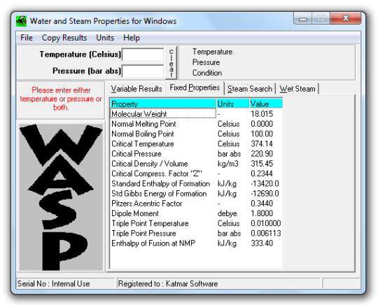 Water And Steam Properties is a demo software by Katmar Software and works on Windows 10, Windows 8.1, Windows 8, Windows 7, Windows XP, Windows 2000, Windows 2003, Windows 2008, Windows Vista, Windows 2012.