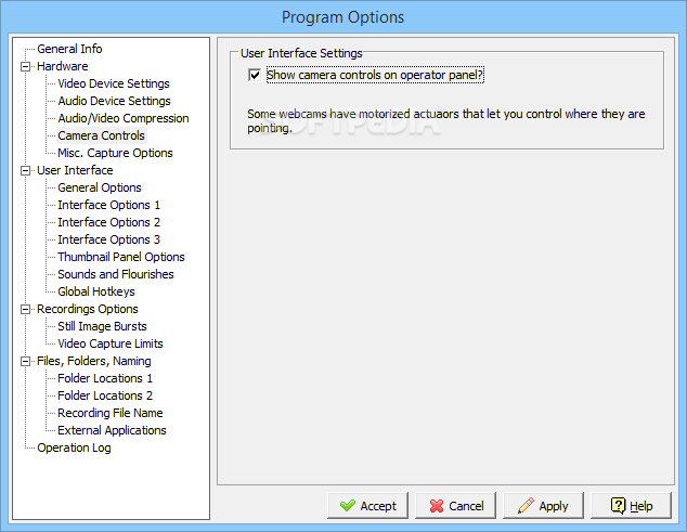 The Program Options window can be accessed from the View menu. One can configure various aspects related to the video recording device used, video and sound track compression, as well as interface, startup behavior, file naming and hotkeys.