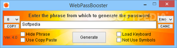 All you have to do is enter a phrase to generate the password from, select the number of characters, show the phrase or hide it from pry eyes, activate a virtual keyboard in case you suspect the computer to be hijacked by keyloggers, as well as include or exclude symbols in the key.