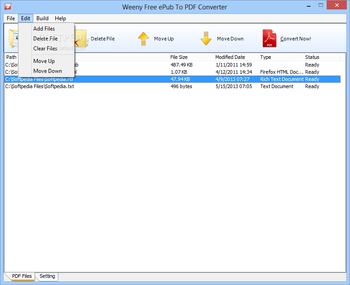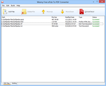 Weeny Free ePub to PDF Converter is an easy-to-use program with a self-explanatory name - it allows you to create PDFs from ePUB files. But it supports other file types for the input as well, such as TXT, HTM, RTF, DOC, DOCX, CHM and DJVU.