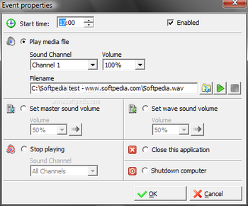 The list of options include defining the time for the event to occur, setting a specific audio file to be played as well as the volume level. Among the supported formats there are MP3, WAV, MID, AVI and WMA.