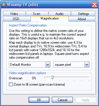 The plugin lets you run the sound of the TV or radio stations through Winamps equalizer, DSP and output plugin. You can use this to get better sound, or to correct problems with a channel (using the automatic equalizer settings). The video can be output in a separate window with captioned or thin frame, or just attached to Winamps video window.