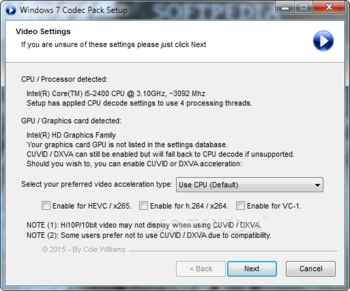 The Installer is designed to give both beginners and experts a method of having codecs prepared for usage. You are able to choose from a simple or detailed process. As suggested, the first takes you through several steps, not requiring much on your behalf other than pressing the “Next†button several times.