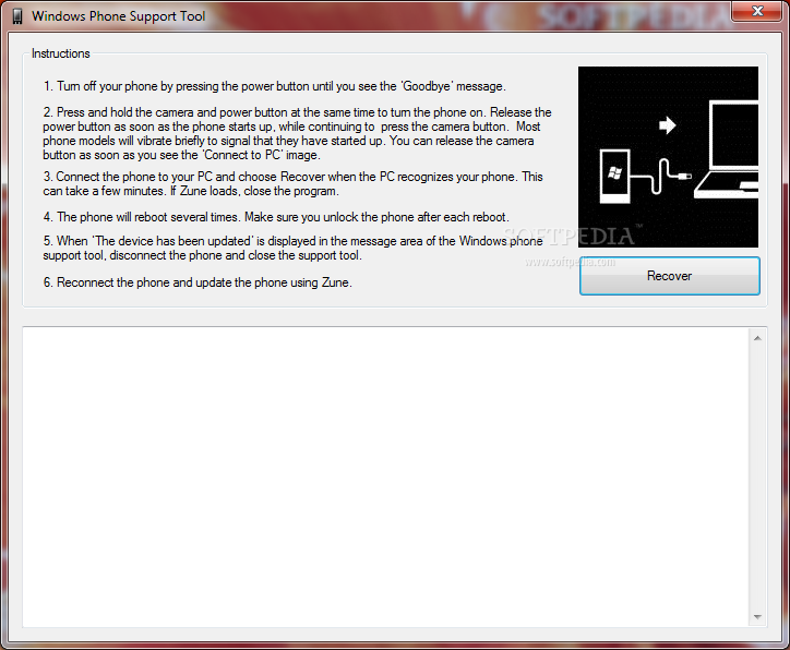 Its main window comprises a set of instructions that you must strictly follow in order to have your Windows Phone updated, together with the logging section, where you can view the history of all the performed actions.