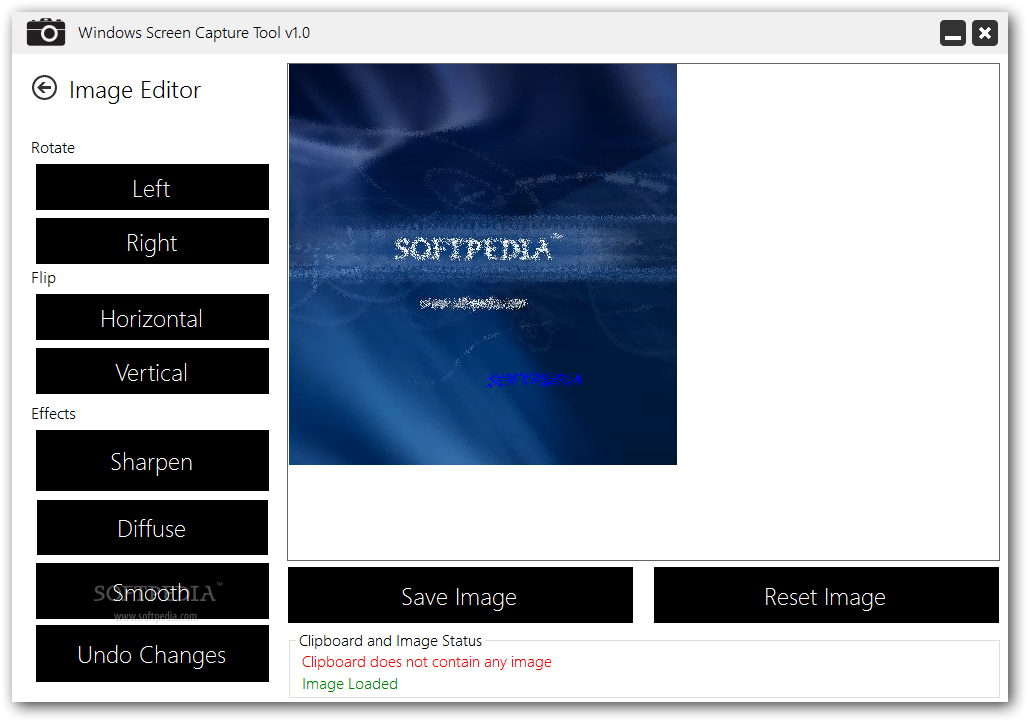 Photos can be saved to JPEG, BMP or PNG format by specifying the output directory and file name. As far as editing functions are concerned, it is possible to rotate or flip picture, as well as apply effects (sharpen, diffuse, smooth). Windows Screen Capture Tool also lets users attach text watermarks with a customizable font, color and position on the image.