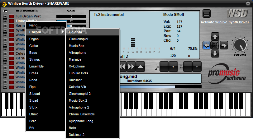 Furthermore, when switching to Extended mode, you have access to a virtual keyboard that can be used to play new sounds. Winlive Synth Driver can even be connected to a digital keyboard via the midi-in port.