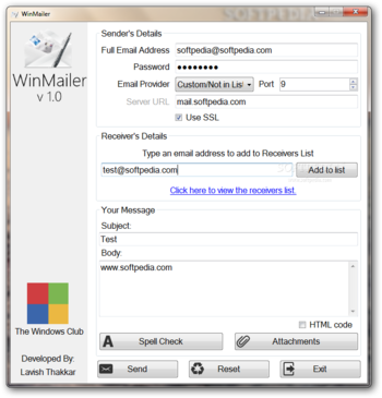 You can either send the message to one email address or multiple ones by creating a list with receivers, which can be viewed anytime to edit or delete entries. When writing the message itself, it is possible to insert HTML code and enable a spellchecker (requires Microsoft Word), apart from attaching files. Settings can be restored to default.