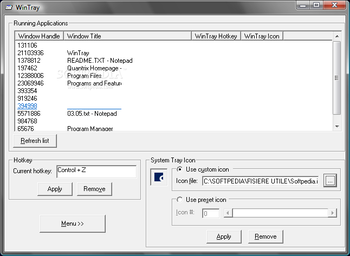 You can download WinTray which is 111.08 KB in size and belongs to the software category Other Desktop Enhancements. WinTray was released on 2007-05-04 and last updated on our database on 2017-02-19 and is currently at version 1.