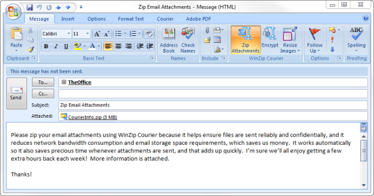 WinZip Courier is a state-of-the-art file compression and encryption technology, Courier delivers the power of WinZip where its needed most - your email system. This easy-to-use tool seamlessly integrates with your email application to automatically zip and protect outgoing files as you work. Simply write your e-mail, attach your files, and click Send - Courier does the rest. Because it works behind the scenes with Microsoft Outlook, Yahoo Mail, Gmail by Google, and Windows Live Hotmail, Courier takes the worry and frustration out of emailing attachments without adding any unnecessary steps. Courier automatically compresses your attachments into a single, small package before sending your email - all without any additional clicks. Whats more, you can preview the contents of zipped email attachments directly in the Outlook preview pane. Couriers new preview functionality lets you see whats inside a Zip file attachment using a simple tree view. You can also double-click on a displayed file to launch its associated application for viewing, editing, or saving - all in one easy step. If you want to email a document, spreadsheet or presentation directly from Microsoft Word, Excel, or PowerPoint, Courier will zip and send these files without leaving the application or interrupting your workflow. Sending confidential information? Email messages can be easily intercepted as they skip across multiple routers, switches, and servers to reach their final destinations, putting any attached files at risk. Use Couriers 128-bit or 256-bit AES encryption to password-protect your attachments from unauthorized access. Courier combines strong encryption with temporary file wiping/shredding to ensure the security of attachments shared over email. Harness the power of WinZip and start sending smaller, safer email - automatically. Try WinZip Courier today.