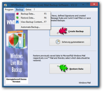 You can download WMBackup which is 2.62 MB in size and belongs to the software category E-mail. WMBackup was released on 2013-03-27 and last updated on our database on 2017-03-27 and is currently at version 3.12.