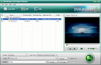 Want to play your favorite DVD movies on your mobile phone or other portable devices? Firstly, you will need to convert DVDs first. Wondershare DVD Ripper Platinum enables you to rips and convert DVDs to the video formats you want easily and fast.The Key Features of Wondershare DVD Ripper Platinum:Fast ripping speed and powerful conversion.Rip DVD to iPod, PSP, PS3, iPhone, Apple TV, Zune, Archos MP4 Player, Creative Zen, iRiver PMP, Pocket PC, HTC Surround, Nokia N8, LG Quantum;Support output files as MPEG4, AVI, WMV, MP4, MOV, FLV, MPG, MPEG, ASF, VOB, and M4V;Extract audio tracks from DVD movie and rip DVD audio tracks to MP3, M4A, AC3, AAC, WMA;Highly support ripping DVD to HD videos including HD MP4, HD MOV, HD WMV, HD MPG, SWF, DV (digital video format), HD MKV, HD AVI (with H.264 encoder) and FLV (with H.264 encoder).Powerful video editing:Allows you to trim any part of your DVD movie, select subtitles, choose audio tracks and add a text or image style watermark on your favorite video.Join several chapters into one file or just rip DVD by chapters or titles;Take a snapshot from movies while previewing and save them as jpeg or bmp files;Advanced setting and optimized profiles:Some devices requires certain parameters you can create new profiles by customizing existing ones;These advanced settings include User defined output files, Resolution for picture definition, Bit Rate for playing speed, Frame Rate for fluency, and Channel for sound;Allows you to set video brightness, contrast, saturation and volume.