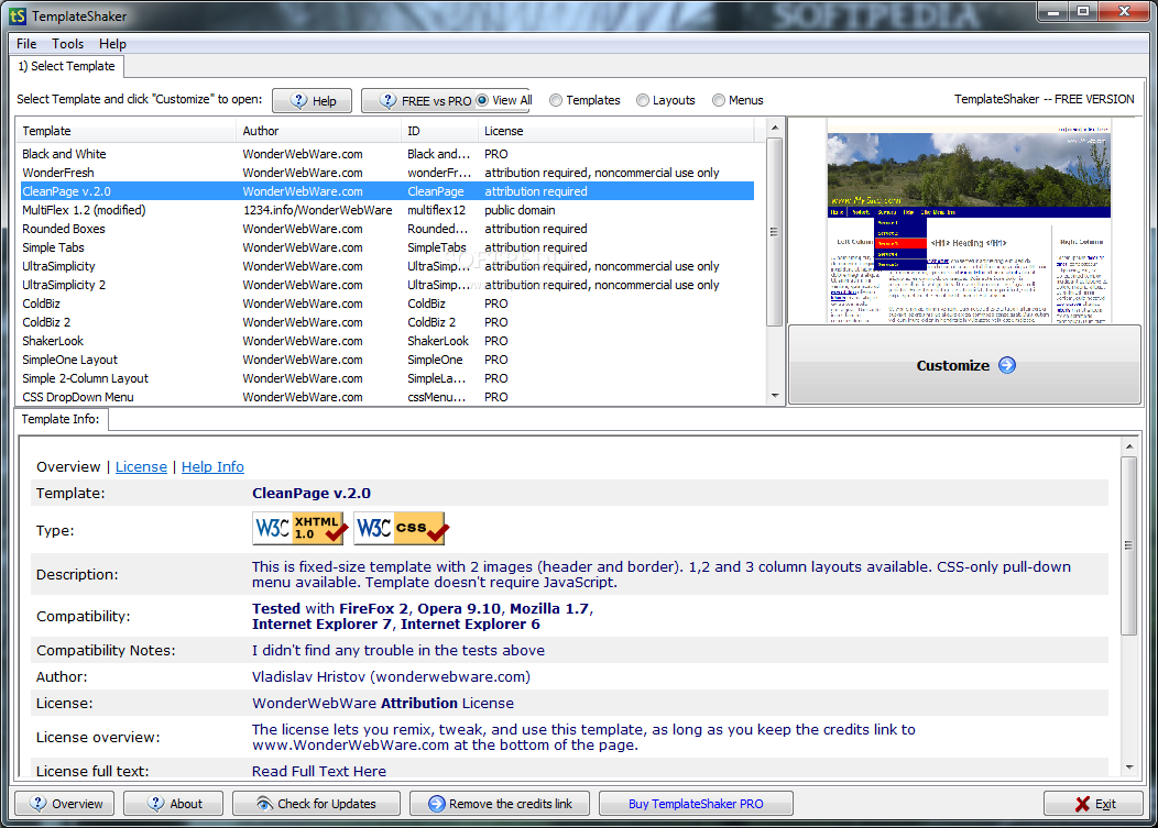 NOTE: If you want to remove the attribution link at the bottom of the templates without violating the license, you must purchase commercial license ("Pro"version) which will permit you to use the templates without attribution requirement (the credits link will be removed) The "Pro" version is separate product and comes with a different license.System requirements256 MB RAM