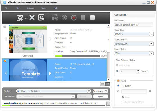 Fancy taking all your PowerPoint presentations (PPTs) on your iPhone and view them wherever and whenever you want? Xilisoft PowerPoint to iPhone Converter is your perfect companion. Using this PowerPoint to iPhone converter, you can convert all your PPTs to iPhone compatible H.264 format quickly and easily.Not merely just a PPT to iPhone converter, Xilisoft PowerPoint to iPhone Converter can also help you make customized iPhone video presentations: rehearse and record your own commentary, add background music, set slide transition interval, and attach your own watermark; convert with all slide features reserved; or convert at maximum speed with all slide features removed.