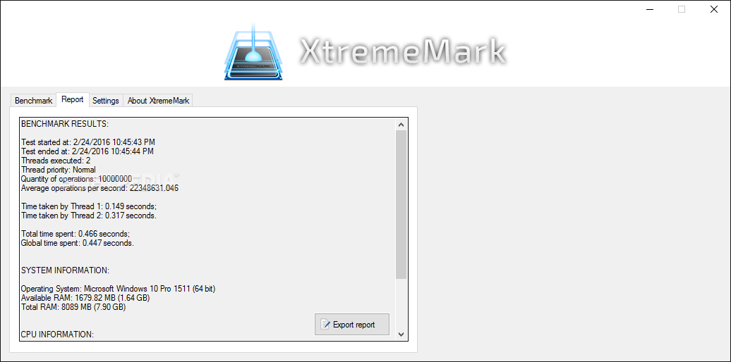 XtremeMark is a lightweight software application whose purpose is to help you assess your processor’s performance by carrying out several benchmarks tests.
