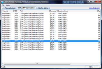 Xyvos System Explorer is a sophisticated system information utility .It shows running process, active TCP /UDP connections and Autorun entries from registry.